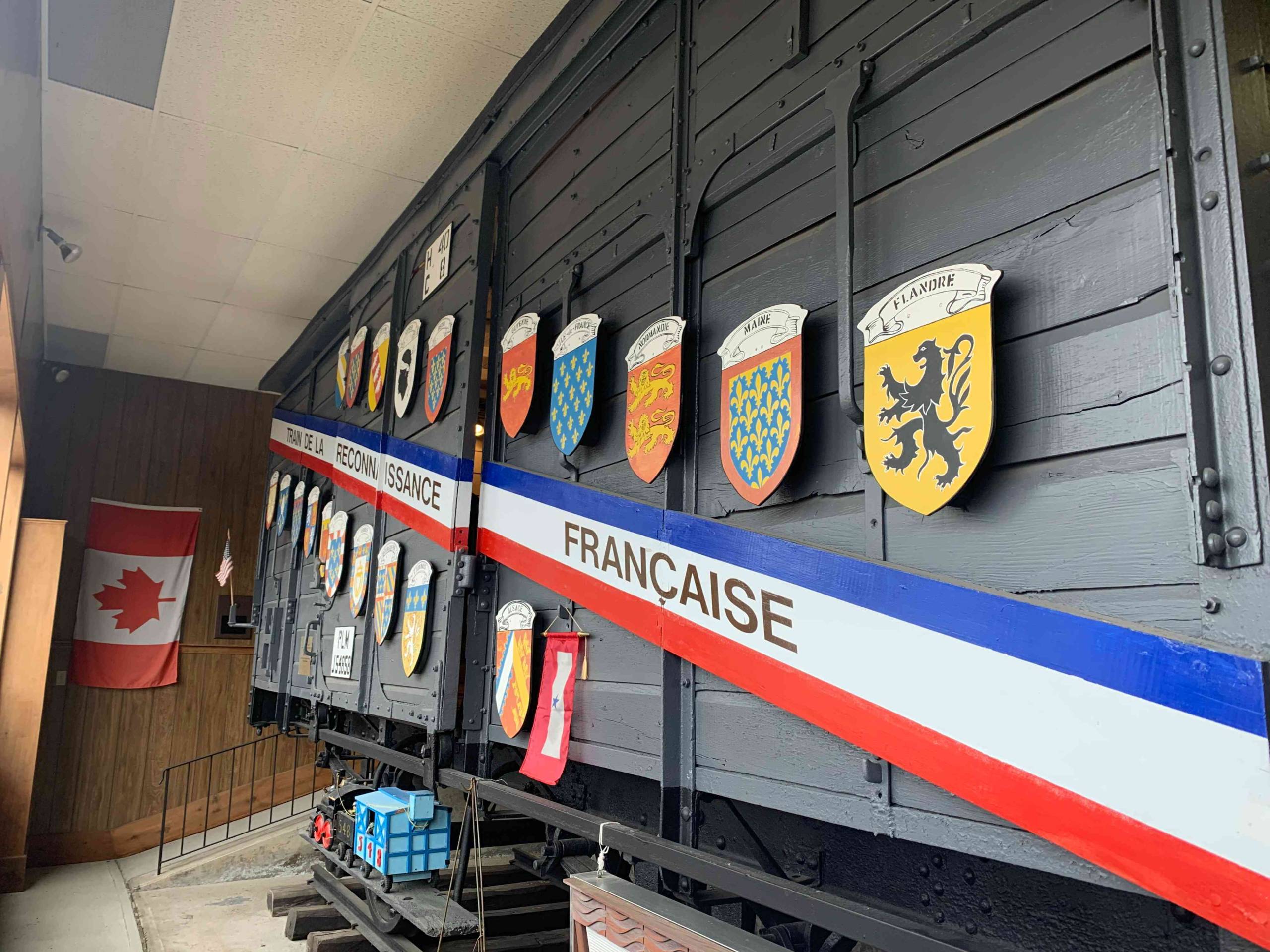 Gregoire unlocks the heavy padlock at the rear of the building, and ushers me inside for a close-up view of the boxcar. The boxcar appears small, almost claustrophobic in nature with a blue-slate-colored exterior, decorated with a series of coats of arms, all belonging to different communes and departments of France. Names like “Orleanais,” “Normandie,” and “Bordeaux” surround the train with vibrant crests of lions and the traditional fleur-de-lis symbol.