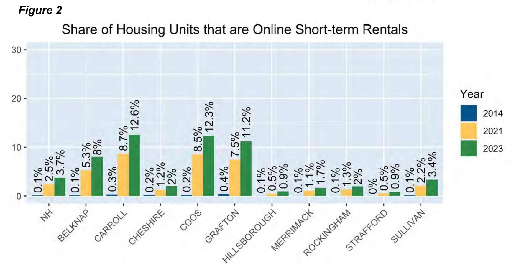 But theyโ€™re more widespread in tourism-heavy regions in Carroll, Coos, Belknap and Grafton counties, where 8% to 13% of housing units are online short-term rentals. The town of Lincoln has the highest rate, at 42.5%.