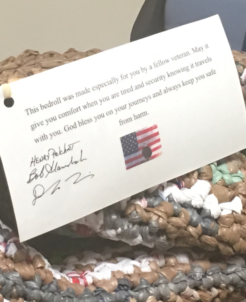There’s even a bedroll, knitted out of garbage bags by veterans. The knitters signed their names and added a note: “This bedroll was made especially for you by a fellow veteran. May it give you comfort when you are tired and security knowing it travel with you. God bless you on your journeys and always keep you safe from harm.”