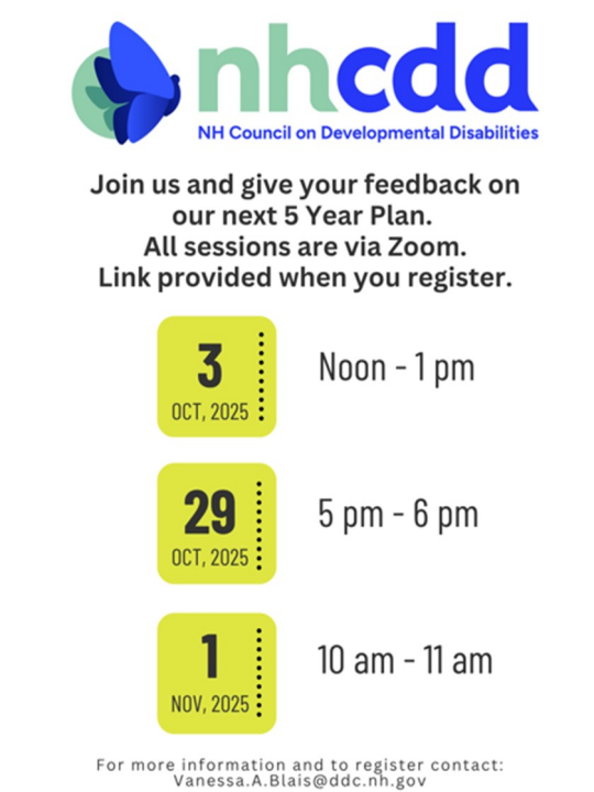 CONCORD, NH – The public is invited to join the NH Council on Developmental Disabilities for a virtual feedback session on the NHCDD proposed 5 Year Plan. There will be 3 sessions – Oct. 3, 12-1 p.m.; Oct. 29, 5-6 p.m. ad Nov. 1, 10-11 a.m. For more information please contact Vanessa Blais, Director of Policy and Planning at Vanessa.A.Blais@ddc.nh.gov or 603-271-7040.