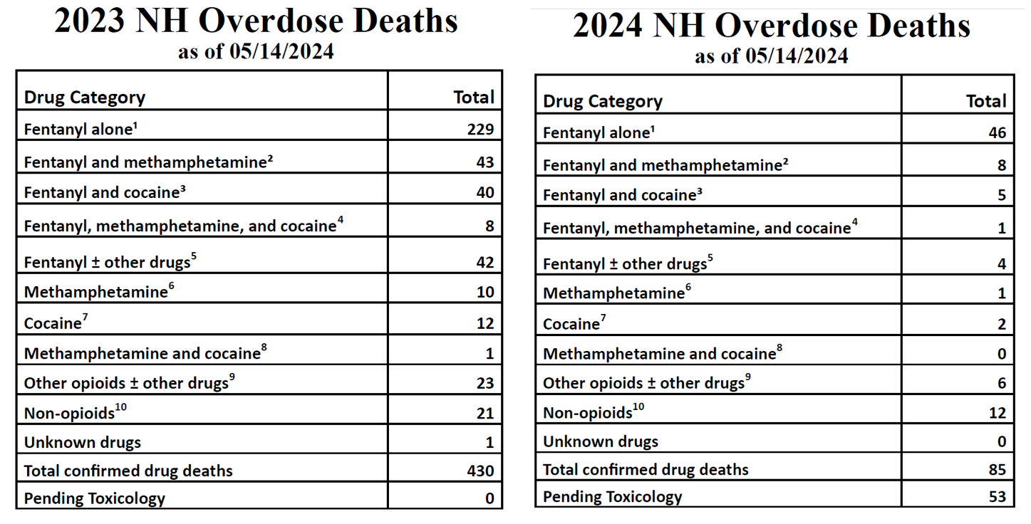 The national CDC, which also released statistics Wednesday, listed 421 overdose deaths in New Hampshire, down from 484 in 2022, a 13.02% decline. The CDC notes that its numbers are provisional, pending final data.