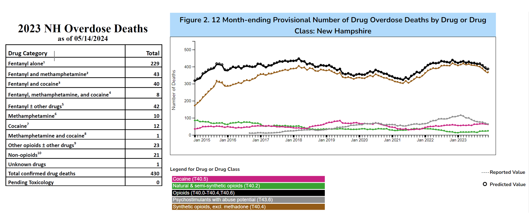 New Hampshireโs 430 overdose deaths in 2023 were the lowest in three years, according to New Hampshire State Medical Examiner Office statistics, right, as well as the national Centers for Disease Control (left). Graphic/Ink Link