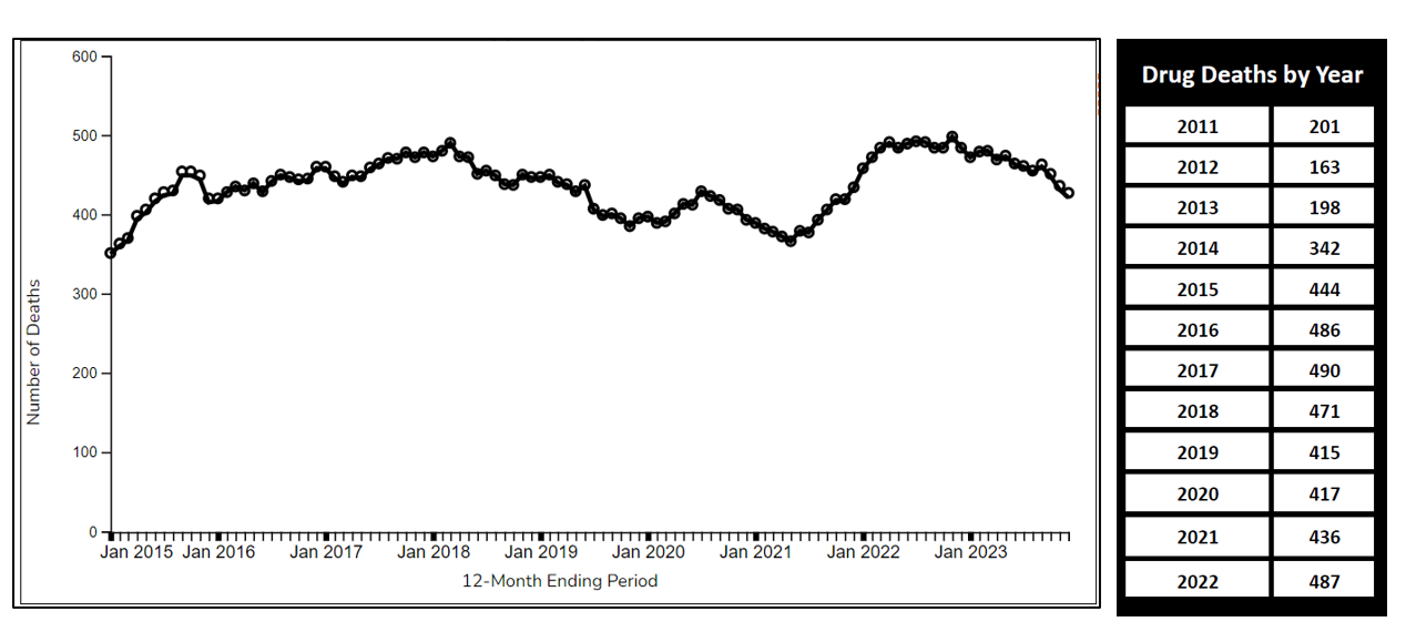 The amount of overdose deaths for 2023, is the lowest for the state in a calendar year since 2020, when the medical examiner logged 415 deaths.ย