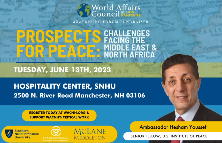 MANCHESTER–Despite talk of a United States disengagement from the Middle East and North Africa, U.S. military engagement has increased over the past decade. While political and military leaders continue to shift their focus to Asia, and more specifically the rising competition with China, the Middle East and North Africa have continued to command the attention of the West. The World Affairs Council of New Hampshire invites the public to join a conversation with Amb. Hesham Youssef, Senior Fellow at the US Institute of Peace, on the “Prospects for Peace: Challenges Facing the Middle East and North Africa” as part of the Global Forum Fundraiser.