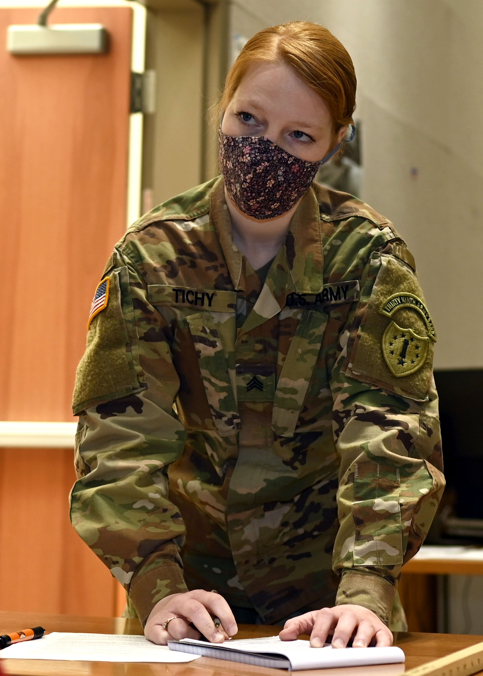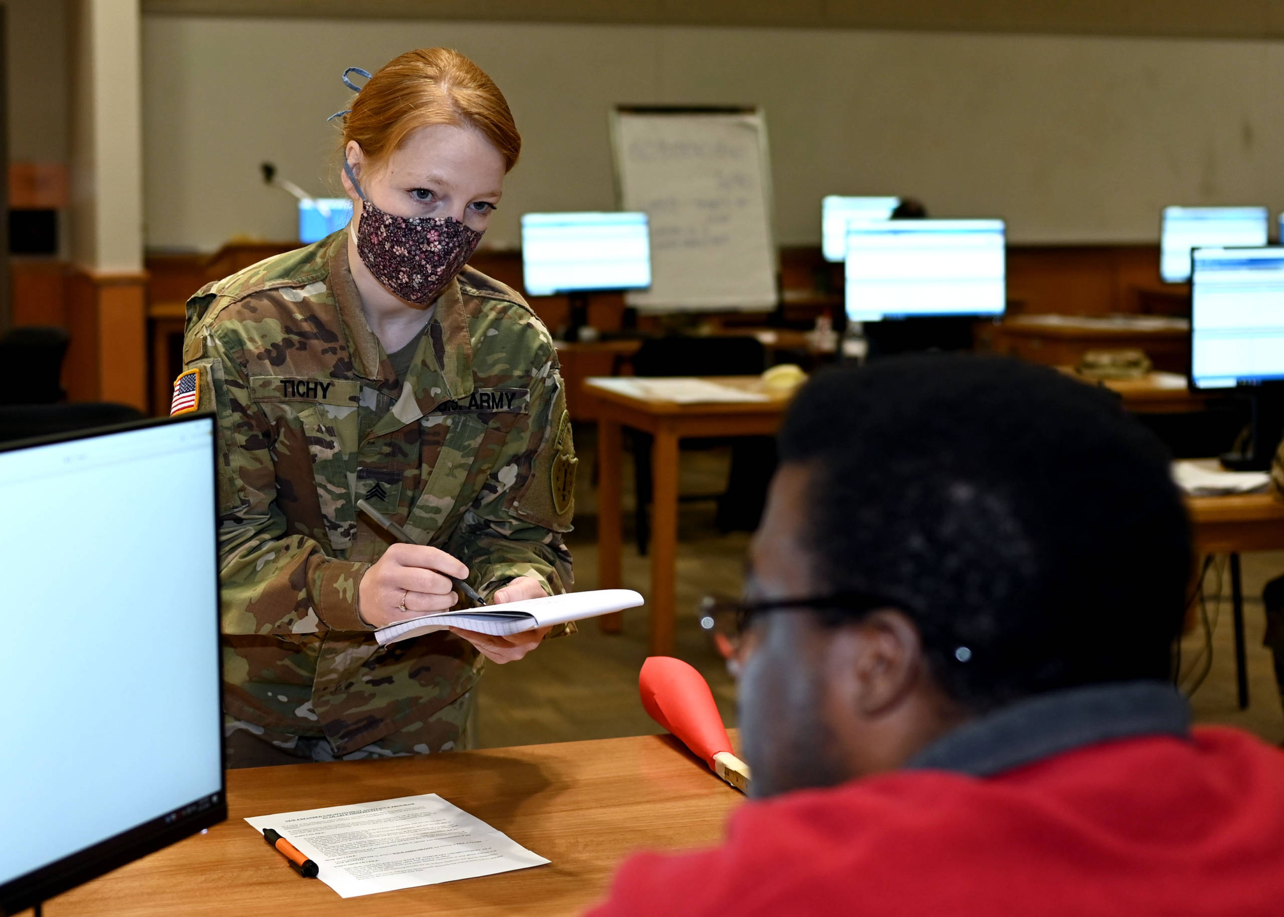 Sgt. Alexandra Tichy, a flutist with the 39th Army Band, New Hampshire Army National Guard, takes instructions from Kevin Myers, a supervisor at an unemployment call center in Concord, April 21. Tichy is one of 34 soldiers screening calls at the makeshift center, which comprises 22 musicians from the 39th. Guardsmen staff three call centers in the capital region to field thousands of calls, which were previously going unanswered. Photo by Staff Sgt. Charles Johnston, NHNG Deputy State PAO.