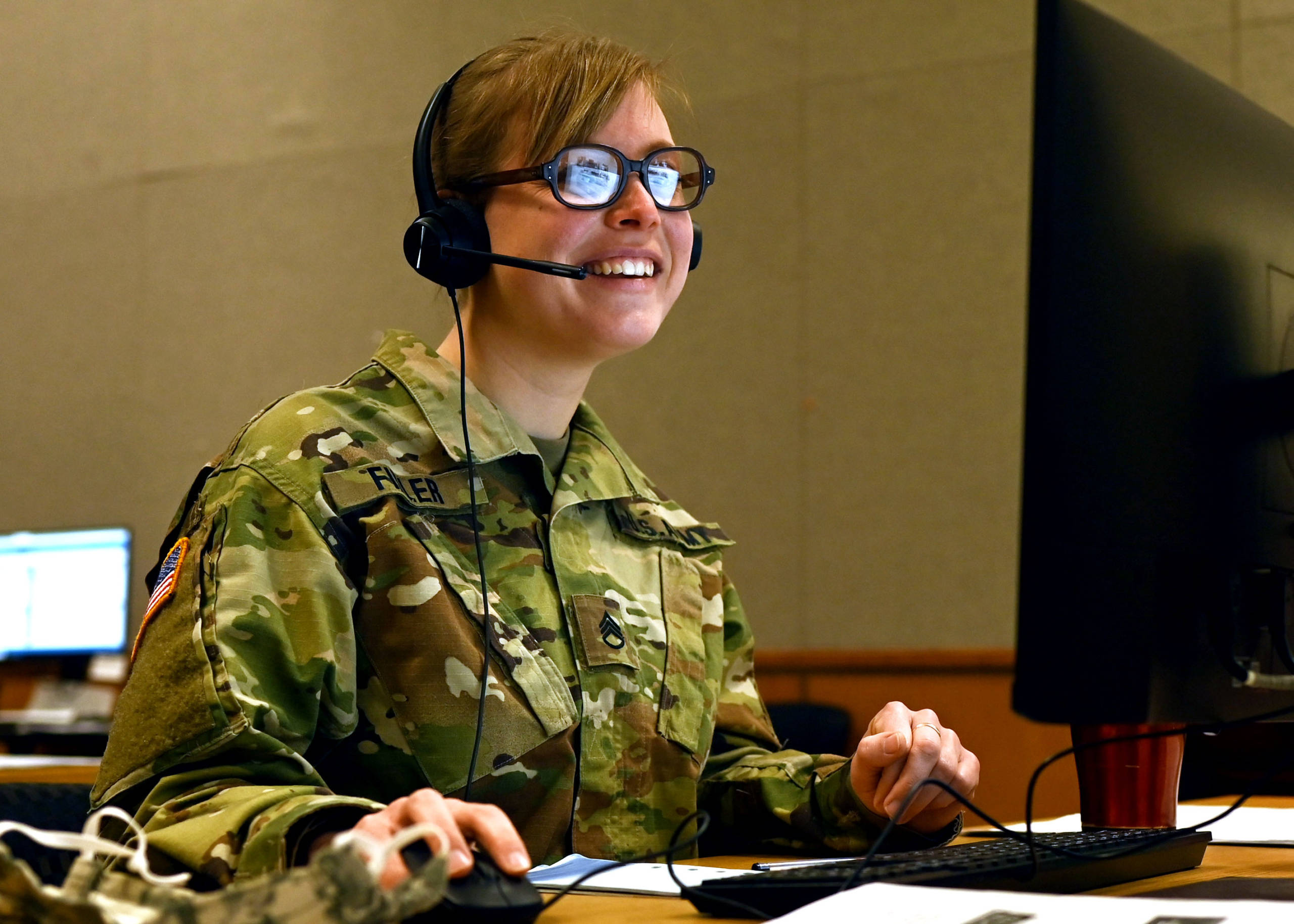 Staff Sgt. Emily Fixler, a clarinet player in the 39th Army Band, New Hampshire Army National Guard, works the phone lines at an unemployment call center on Hazen Drive in Concord, April 21. Fixler is one of 34 guardsmen placed on active duty at the makeshift center, necessitated by the COVID-19 crisis and supervised by N.H. Employment Security. Guardsmen currently staff three similar makeshift call centers in the capital region. Photo by Staff Sgt. Charles Johnston, NHNG Deputy State PAO.