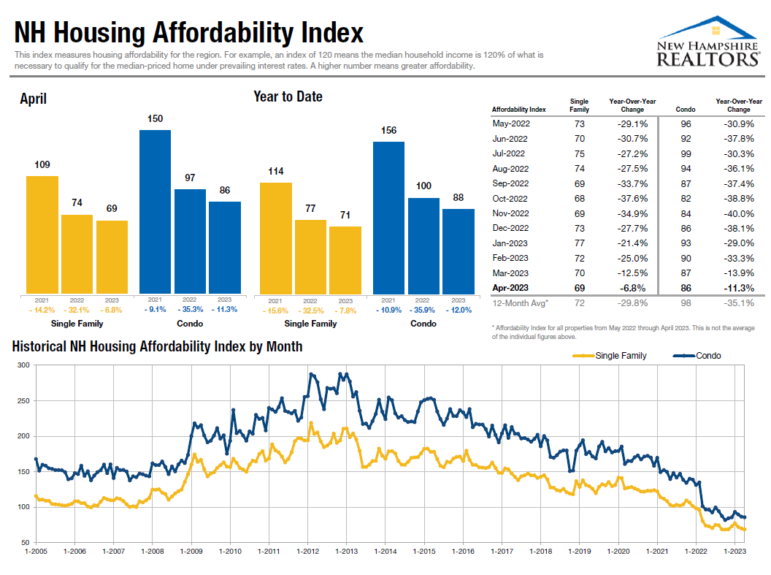 The affordability index โ the indicator of how the average New Hampshire residentโs ability to buy a single-family home โ dropped to 69 in April. That means that median income in New Hampshire is 69% of whatโs necessary to qualify to buy a median-priced home. The index takes into consideration what a monthly payment would be, measuring price, interest rates, property taxes and insurance. The affordability index over the past 12 months has been the lowest in 20 years.