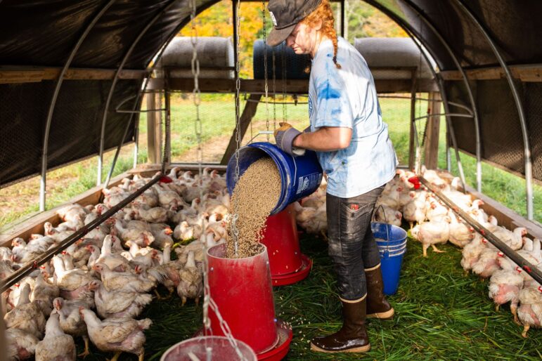 Feeding the chickens at Vernon Family Farms in Newfields, NH