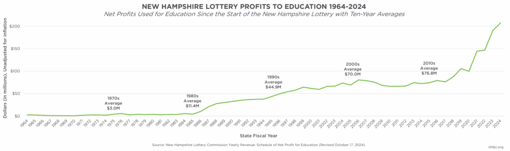 Lottery profit growth has made the State lottery an important source of education funding. In dollars, lottery profits were relatively small (between about $836,000 and $5.7 million) until the late 1980s, when they began to rise. They continued to trend upward through the 2000s and early 2010s, when they stagnated between $59 and $80 million each year. Especially since 2019, New Hampshire has experienced a significant increase in yearly lottery profit, exceeding $207 million in State Fiscal Year 2024.