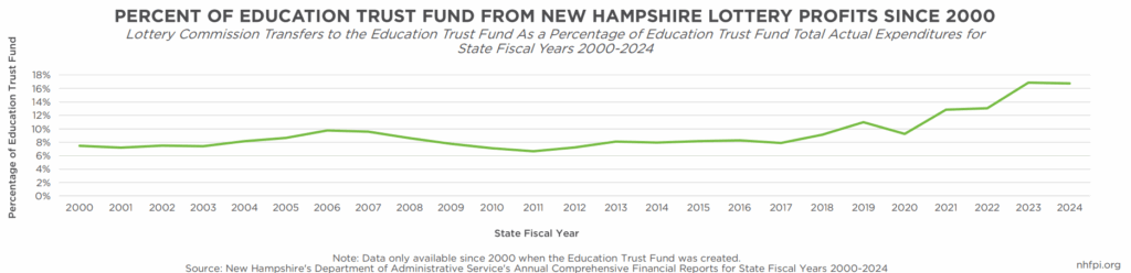 In 2000, New Hampshire created the Education Trust Fund (ETF). The Lottery Commission transfers its profits to that fund. Until 2019, lottery transfers comprised between six and 10 percent of actual education expenditures from the ETF. Since 2019, there has been an uptick, with the proportion exceeding 10 percent every year except 2020, and in the last two years, reaching almost 17 percent.