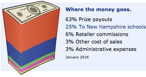A percentage of profits from annual sales of NH Lottery tickets is committed to education โ currently, about 26 cents of each dollar spent on Lottery tickets goes back to the state as aid to education, although the formula has shifted since 1964. Back then, 48.2 percent of lottery ticket sales went toward education. In 2016, 25.7 percent of the $308,568,767 in lottery ticket sales went to education funding, amounting to $79,184,886 (you can see the annual breakdown of revenue and funding below).