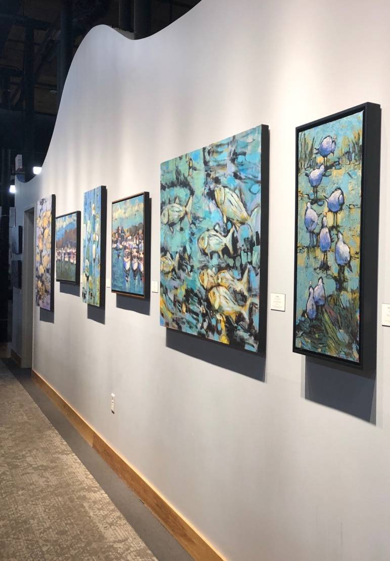 Vratsenes’ passion for painting began over 40 years ago. She has evolved in her technique, starting off as a watercolorist, focusing on detail on a smaller scale and then discovering oils, which brought a completely new approach to her paintings. Transitioning to acrylics after many years of exploring oils, her work is loose, playful, full of color and unique with subjects such as coastal birds, fish, animals and landscapes of New Hampshire. Her technique includes the use of a palette knife, which adds texture and weight to her work. The palette knife allows for the under colors of her paintings to be seen, giving an unexpected pleasing result. Vratsenses’ latest exhibit, showcased at Sullivan Framing & Fine Art Gallery in Bedford, features a blend of impressionism with an abstract composition that bursts with color and excitement.