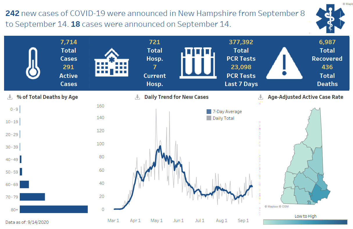 CONCORD, NH โ On Monday, November 23, 2020, DHHS announced 445 new positive test results for COVID-19, for a daily PCR test positivity rate of 3.7 percent. Todayโs results include 316 people who tested positive by PCR test and 129 who tested positive by antigen test. There are now 4,304 current COVID-19 cases diagnosed in New Hampshire.