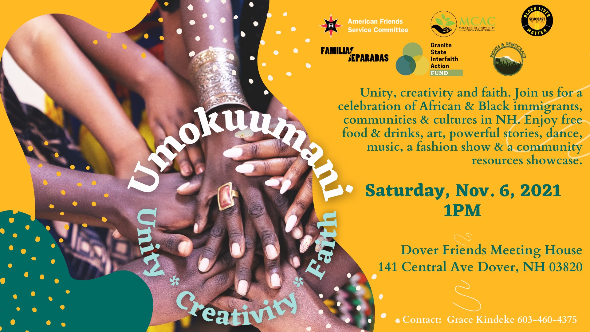 DOVER, NH – A community celebration called Umokuumani: Unity, Creativity and Faith. A Celebration of African and Black immigrant communities in New Hampshire, is planned for Saturday, November 6 from 1 to 4 p.m. at the Dover Friends Meetinghouse, 141 Central Avenue, in Dover.