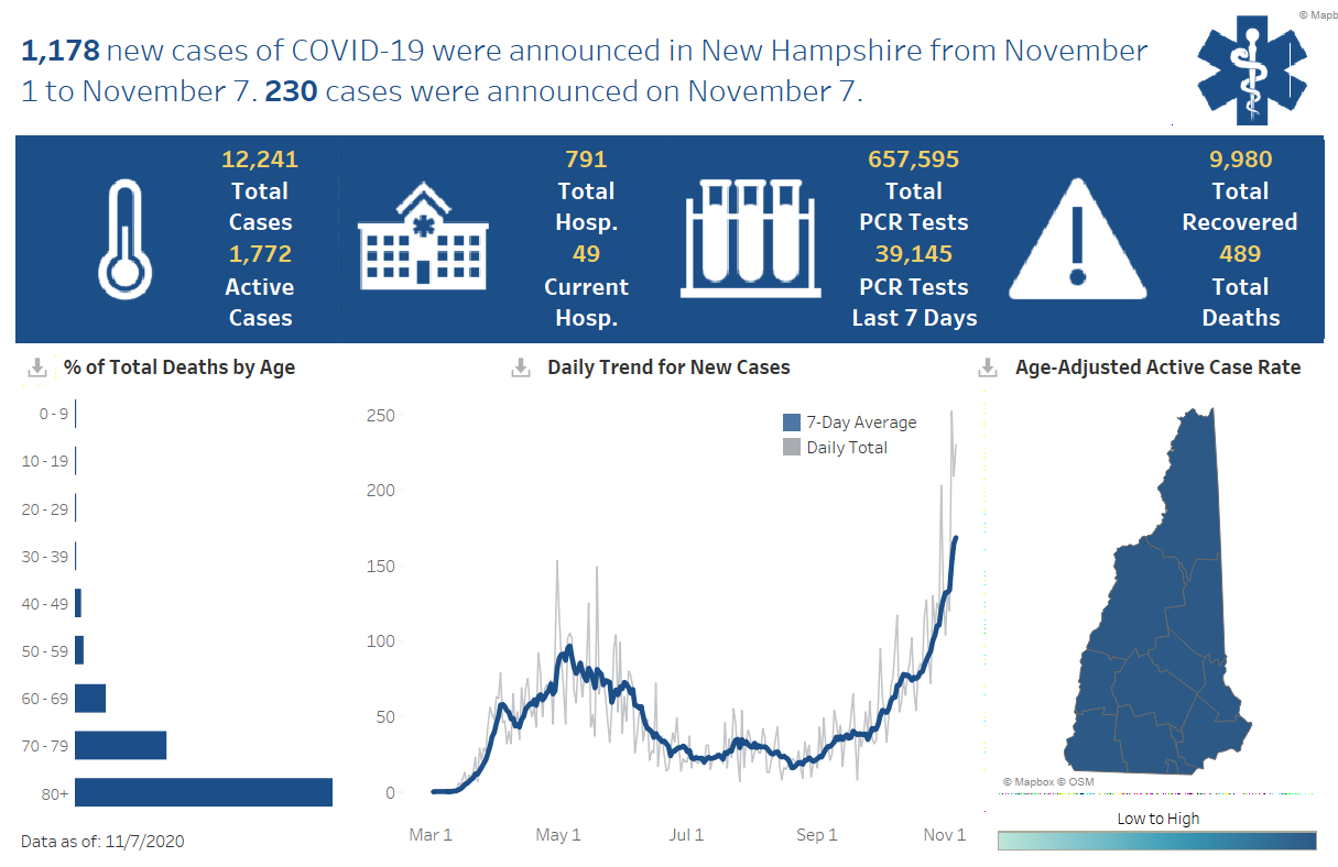 New Hampshire 2019 Novel Coronavirus (COVID-19) Summary Report (data updated November 8, 2020, 9 a.m.)ย