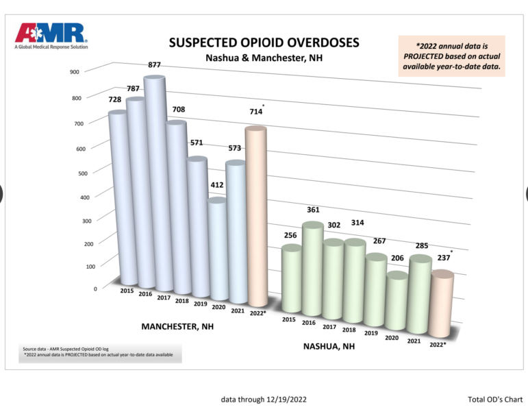 In a report released on Monday, AMR indicated that there were 48 suspected opioid overdoses in November, bringing the year-to-date total to 656. There were also three suspected opioid overdose deaths, that would bring the year-to-date total to 73, although that figure is preliminary and subject to confirmation by the Office of the Chief New Hampshire Medical Examiner.