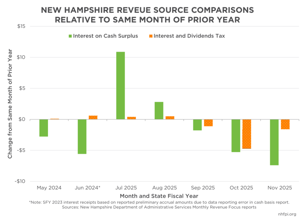 In November, receipts from these two sources both fell behind prior year receipts. The New Hampshire Department of Revenue Administration identified the Interest and Dividend Tax receipts coming in $0.6 million behind the month’s plan, and $1.6 million below last November, was primarily due to the lower tax rate in the phase out of the tax. Lower overall interest rates and smaller cash holdings by the State in November likely contributed to less interest income generated in November. Year-to-date interest income was still $38.0 million above planned amounts, but about $758,000 behind last year’s collections through the end of November. Monthly interest collections reported by the State totaled $12.5 million in November of SFY 2024, while they slowed to $5.1 million in November SFY 2025. While both Interest and Dividends Tax revenues and interest earned can be erratic from month-to-month, the last three months of data suggest these revenue sources may not provide revenue growth through the end of SFY 2025.
