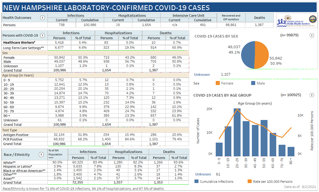 The most up-to-date laboratory testing data, positivity rates and vaccination data are available on the COVID-19 dashboards atย https://www.covid19.nh.gov/dashboard/overview.
