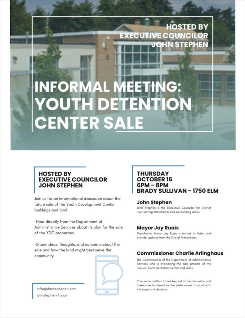 MANCHESTER, NH โ The future of the 144-bed Sununu Youth Services Center will take center stage on Oct. 16 when the public is invited to hear from city and state officials at Brady Sullivan Tower, 1750 Elm St., to discuss what many describe as a once-in-a-generation redevelopment opportunity for Manchester, the region, and the state.