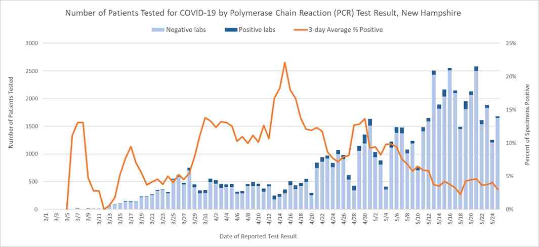 2 Includes specimens tested at the NH Public Health Laboratories (PHL), LabCorp, Quest, Dartmouth-Hitchcock Medical Center, Mako, certain hospital laboratories, the University of New Hampshire and their contracted laboratory, and those sent to CDC prior to NH PHL testing capacity.