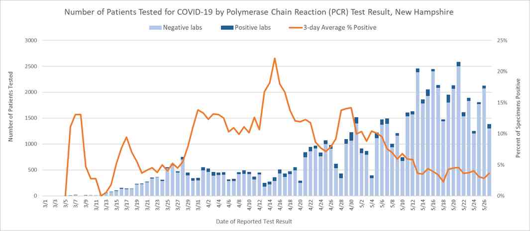 2 Includes specimens tested at the NH Public Health Laboratories (PHL), LabCorp, Quest, Dartmouth-Hitchcock Medical Center, Mako, certain hospital laboratories, the University of New Hampshire and their contracted laboratory, and those sent to CDC prior to NH PHL testing capacity.