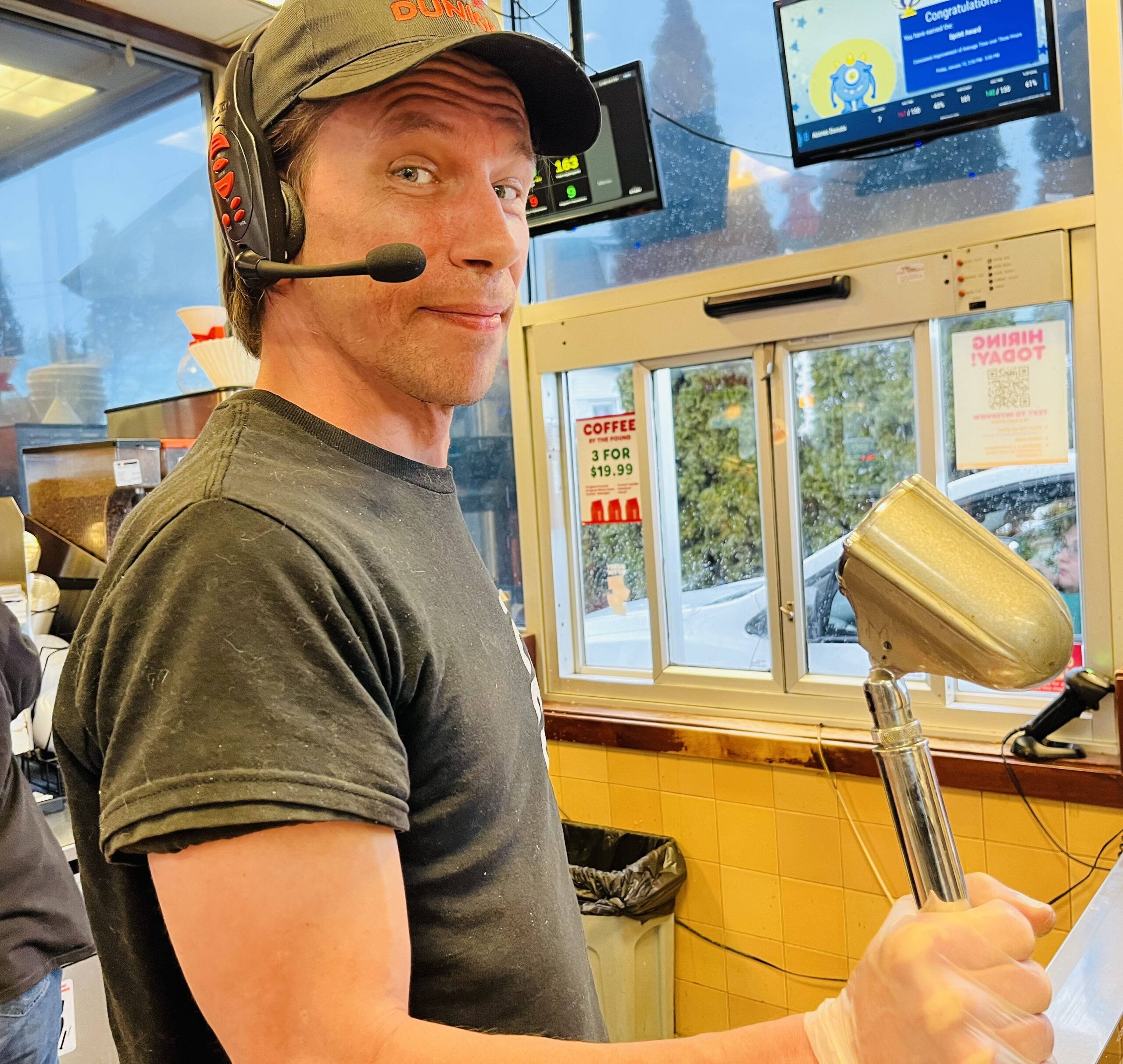 Yeager, who has been working at Dunkins for two-and-half years now, has been, as he says, “fine-tuning my brand of delivery to lucky coffee drinkers for the last two years.”