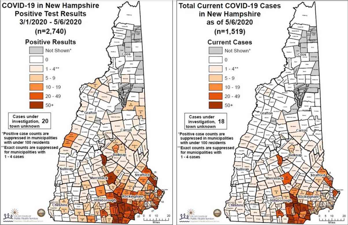 The Harvard Global Health COVID-19 Risk and Suppression Chart for New Hampshire this week shows that Coos, with no cases, and Grafton, Cheshire, and Merrimack counties are on track for containment of the virus, she said.
