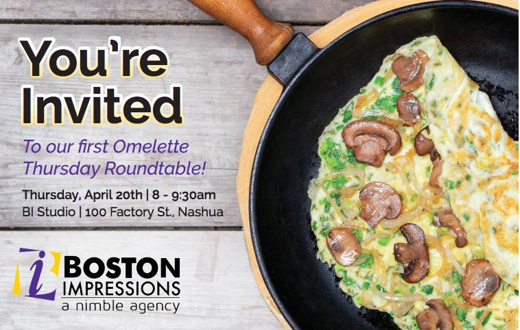 Bring your marketing and Inbound questions – or success stories to the table on April 20 from 8-9:30 a.m., at Boston Impressions, 100 Factory St. in Nashua. We’ll provide the omelettes and the marketing expertise. Our very own Creative Director, Tim Lord, and Lead Generation Guru, Daryl Eames, will share their insights and open the floor to a Q&A. Ask how we created half a million dollars revenue in the pipeline for one of our clients! To register email: sha@bostonimpressions.com
