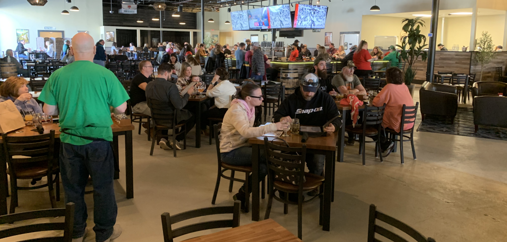 Located in a fairly nondescript strip mall downtown, Omnium Brewing’s space inside is quite large. They had plenty of indoor waiting space, should they be busy during bad weather. To one side of this space they have a large cooler well stocked with cans of beer to go. A hostess was nearby, behind a podium bearing a sign requesting, “Please wait to be seated.” We asked if we could sit at the bar; she said, “Sure, you may seat yourself there.”