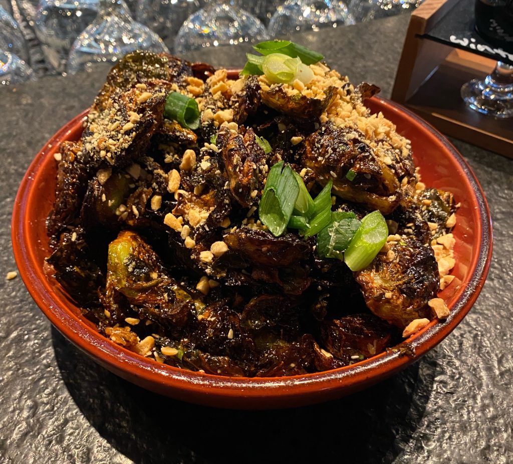 We decided to start with the Crispy Brussels Sprouts. We’re fans of these as appetizers, and frequently order them whenever we see them. From the menu description: Miso Sake Glaze, Toasted Sesame Seeds, Cilantro, Scallions, Peanuts (Vegetarian/ Gluten Free Option). These were absolutely mouth-wateringly delicious. I would order them again in a heartbeat. To be a nitpicker, I must point out that they were not crispy. But they were still delicious just as they were! And the portion was large — for a single person, this could be an entire meal.