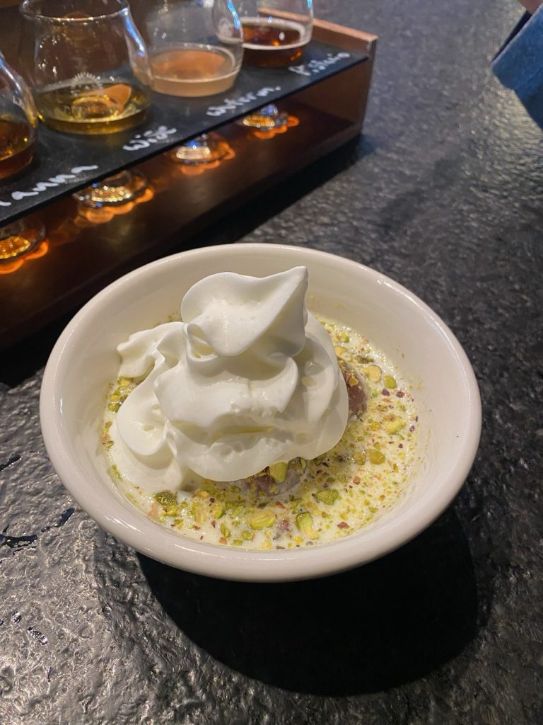 We had leftovers boxed up from our Brussels Sprouts, Sliders, and Cubano, so we just barely avoided making complete pigs of ourselves. Bonus: that meant we had room to try dessert. The menu listed something called Chocolate Dipped Gulab Jamun Truffles. This was like a beautiful and delicious ice cream sunday — except it was not cold! Described as: “Cottage Cheese Dumplings Soaked Saffaron and Cardamon Flavored Syrup Dipped in Chocolate Shell. Served with Sweetened Cream and Sprinkled with Pistachio.” Amazingly tasty!