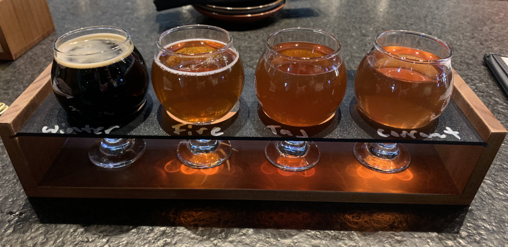 As we often do, we shared flights so that we could each taste a greater variety. Between the two of us, and with our meal, we had 3 flights. Each flight was 4 five ounce pours. So in terms of quantity, that’s a bit less than two beers for each of us. This allowed us to taste 12 distinct beers. By the way, their beer menu listed 33 beers.