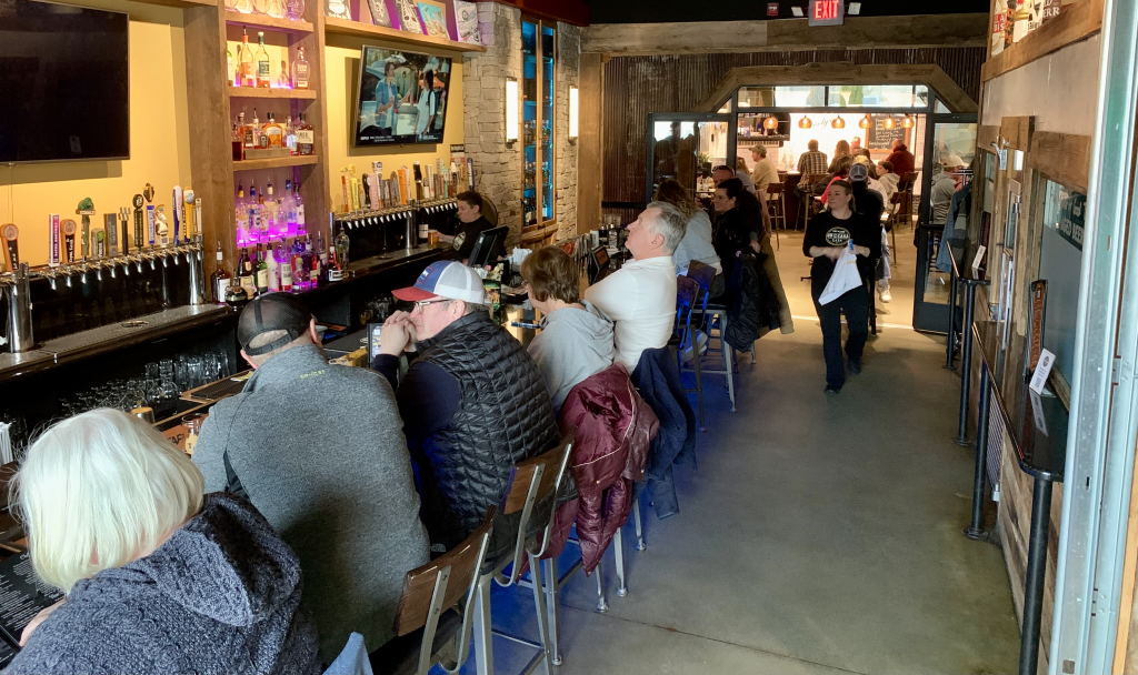 The room with the oyster bar is also pretty full. In the back you can see the white tile wall behind the oyster bar.