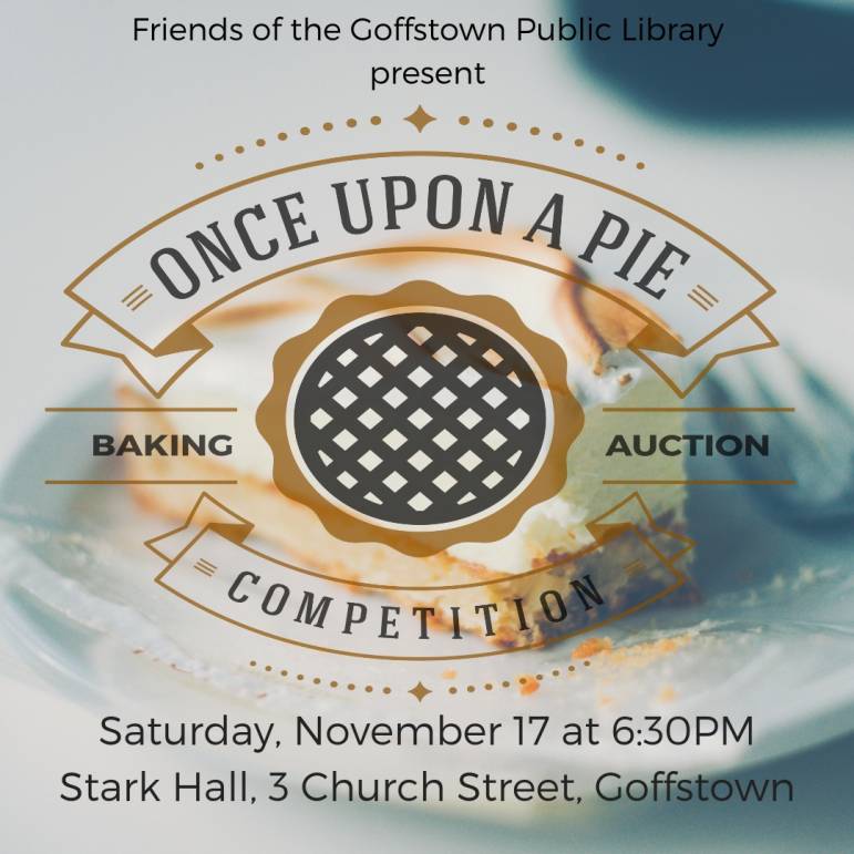 GOFFSTOWN, NH – Bring your friends and family to enjoy a slice of pie or two at this great community event, November 17 at 6:30 p.m., brought to you by the Friends of the Goffstown Public Library. Winning pies in each category will be sold to the highest bidder!