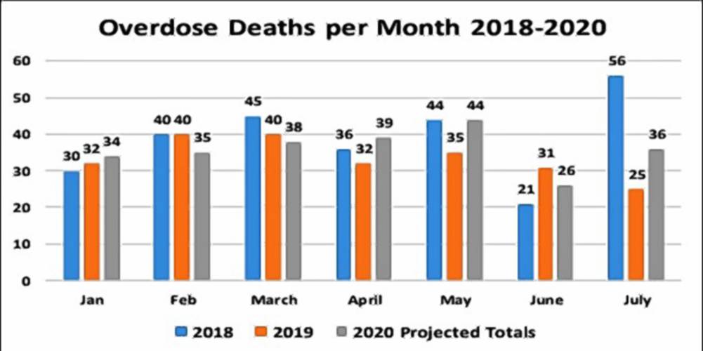 The total deaths so far this year haven’t outpaced the number of fatal overdoses at the same point in 2019. Through July, New Hampshire has had 200 fatal overdoses compared to 235 in 2019. However, the months of April through June show a distinct spike with 145 deaths during the four-month period this year compared to 123 last year.