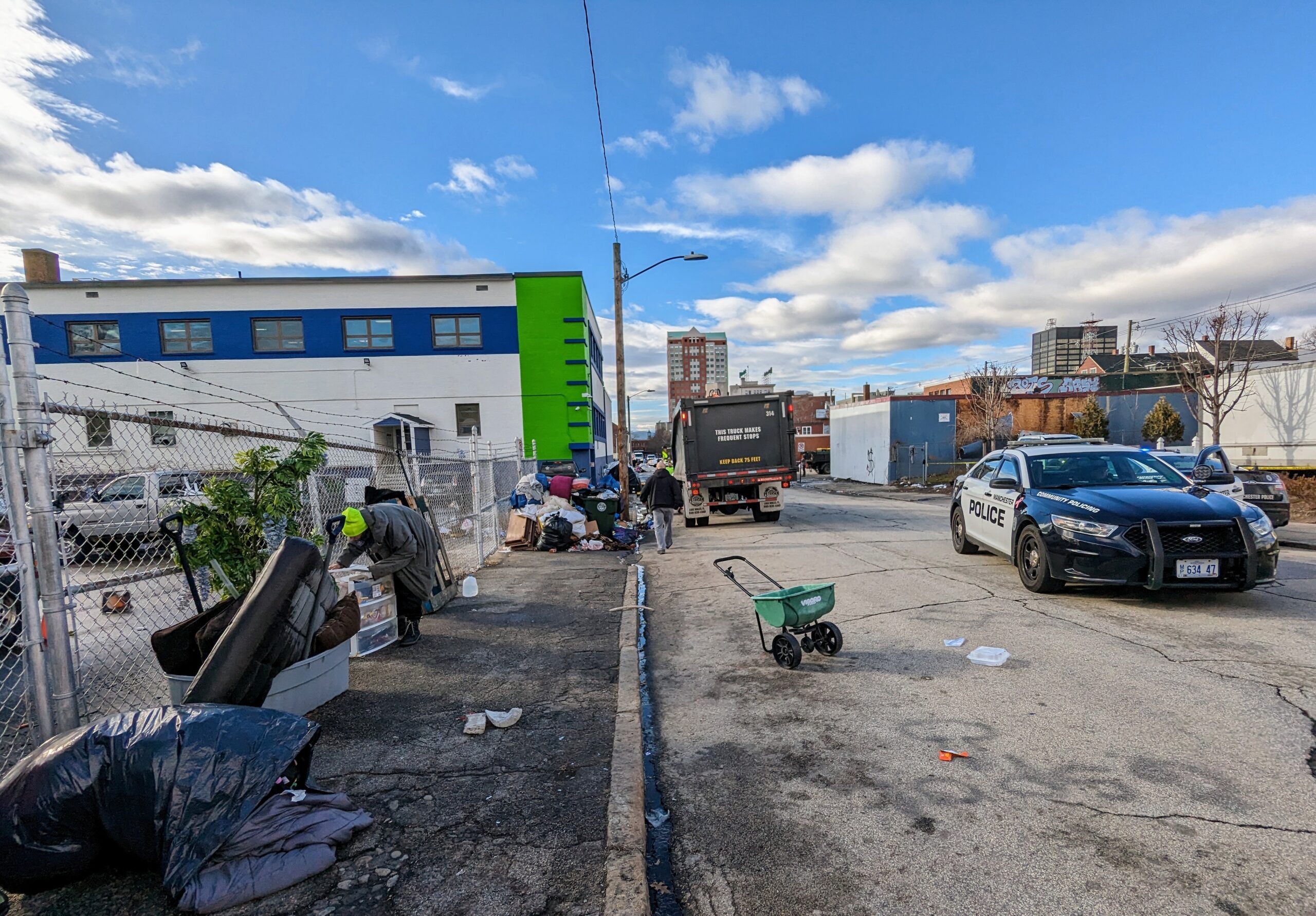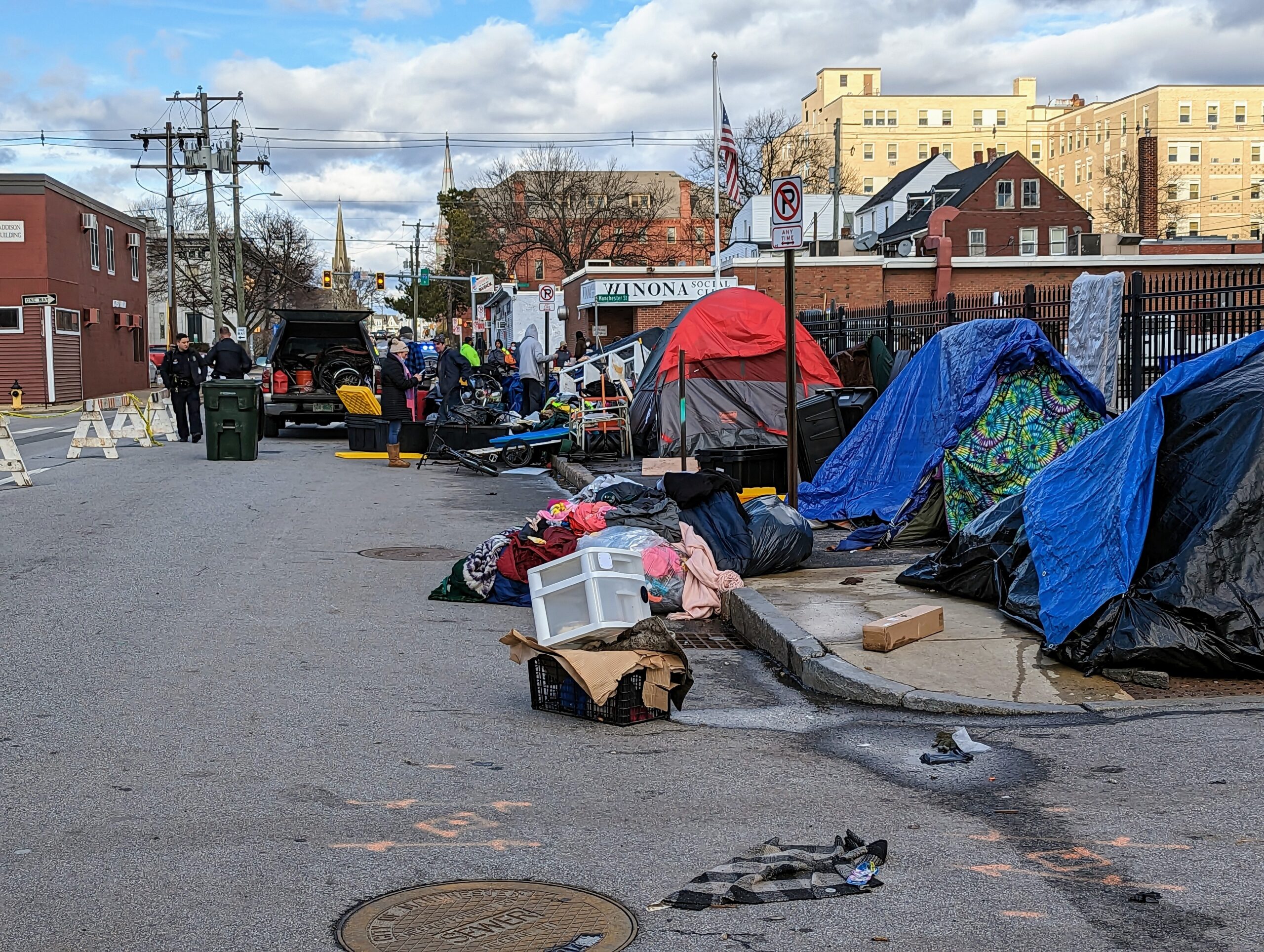 MANCHESTER, NH โ€“ The city’s Department of Public works has delivered totes at the encampment as police begin the process of moving people from Manchester and Pine streets.