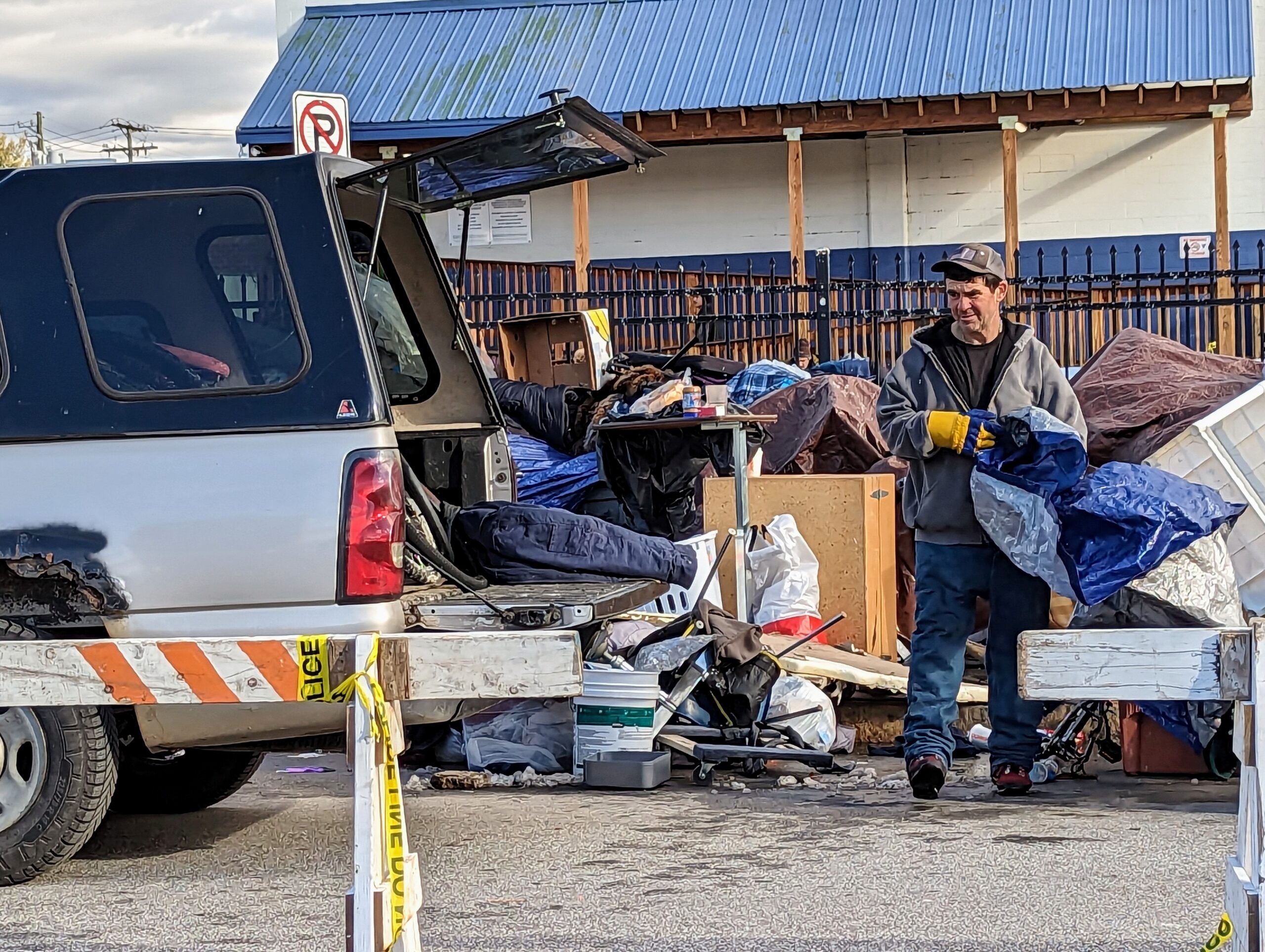 A man, left, gathers up belongings to transport in a seed spreader as a DPW truck parks next to a pile of discarded items for removal. Photo/Carol Robidoux
