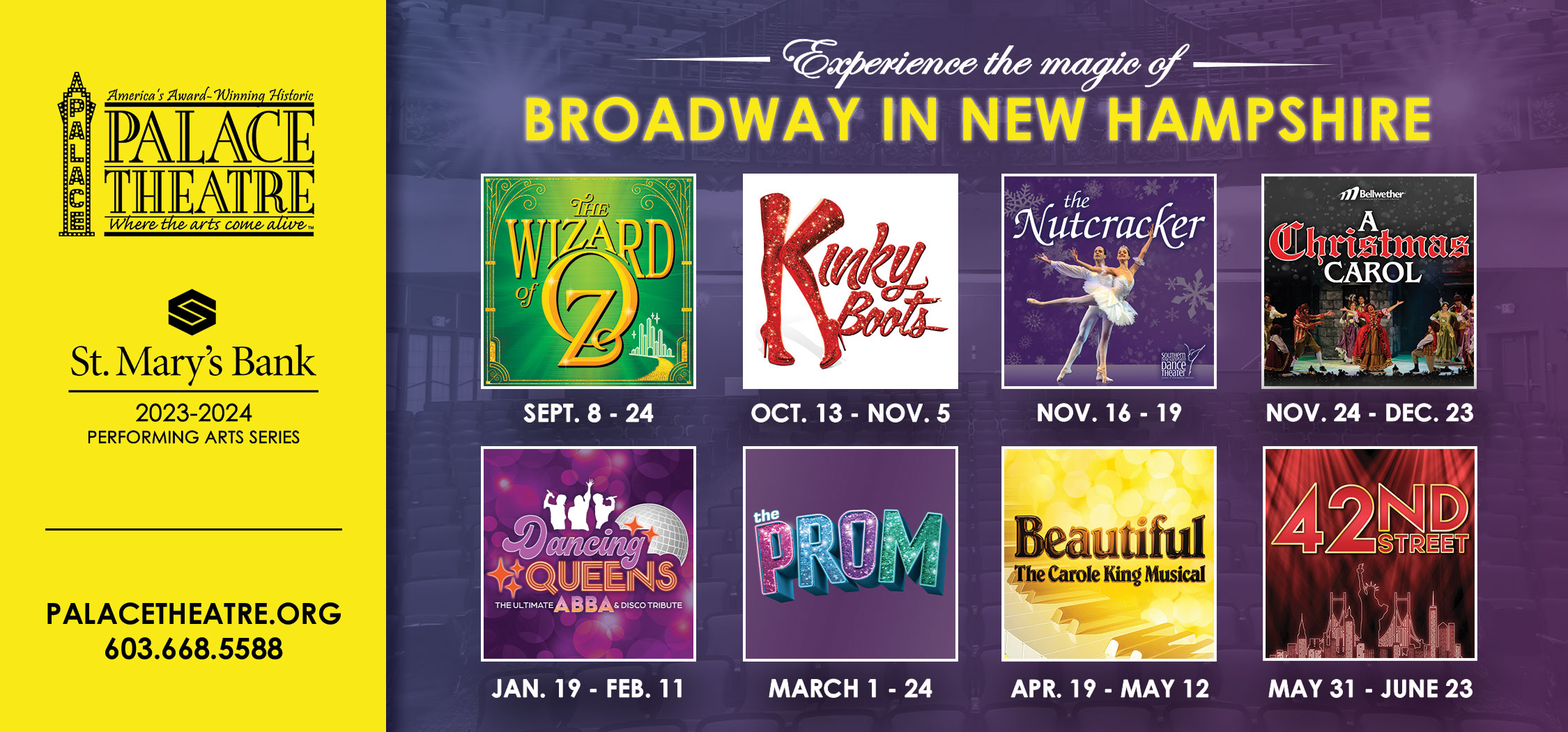 MANCHESTER NH – The Palace Theatres are thrilled to announce its highly anticipated 2023-2024 St. Mary’s Bank Performing Art Series. From September to June, the Palace Theatre provides a lineup of productions, including some brand-new shows and beloved classics, that deliver unforgettable performances and world-class talent directly to Manchester.