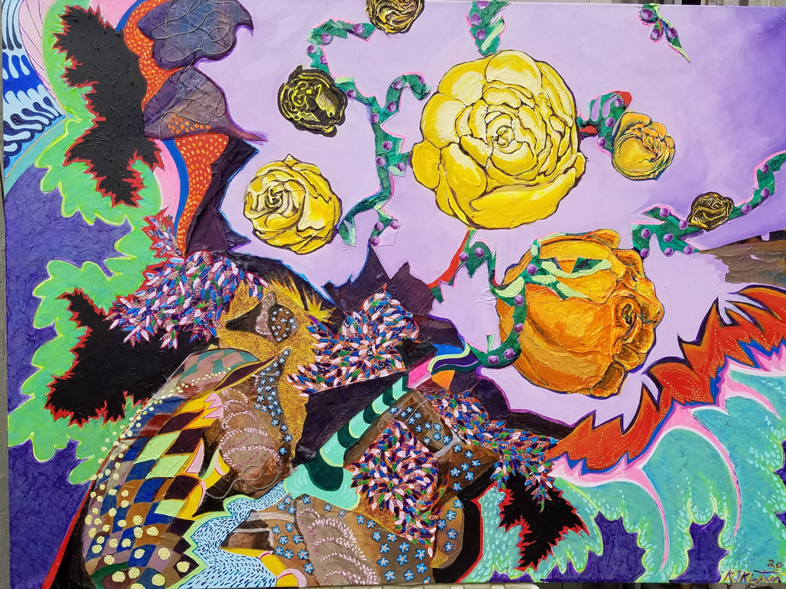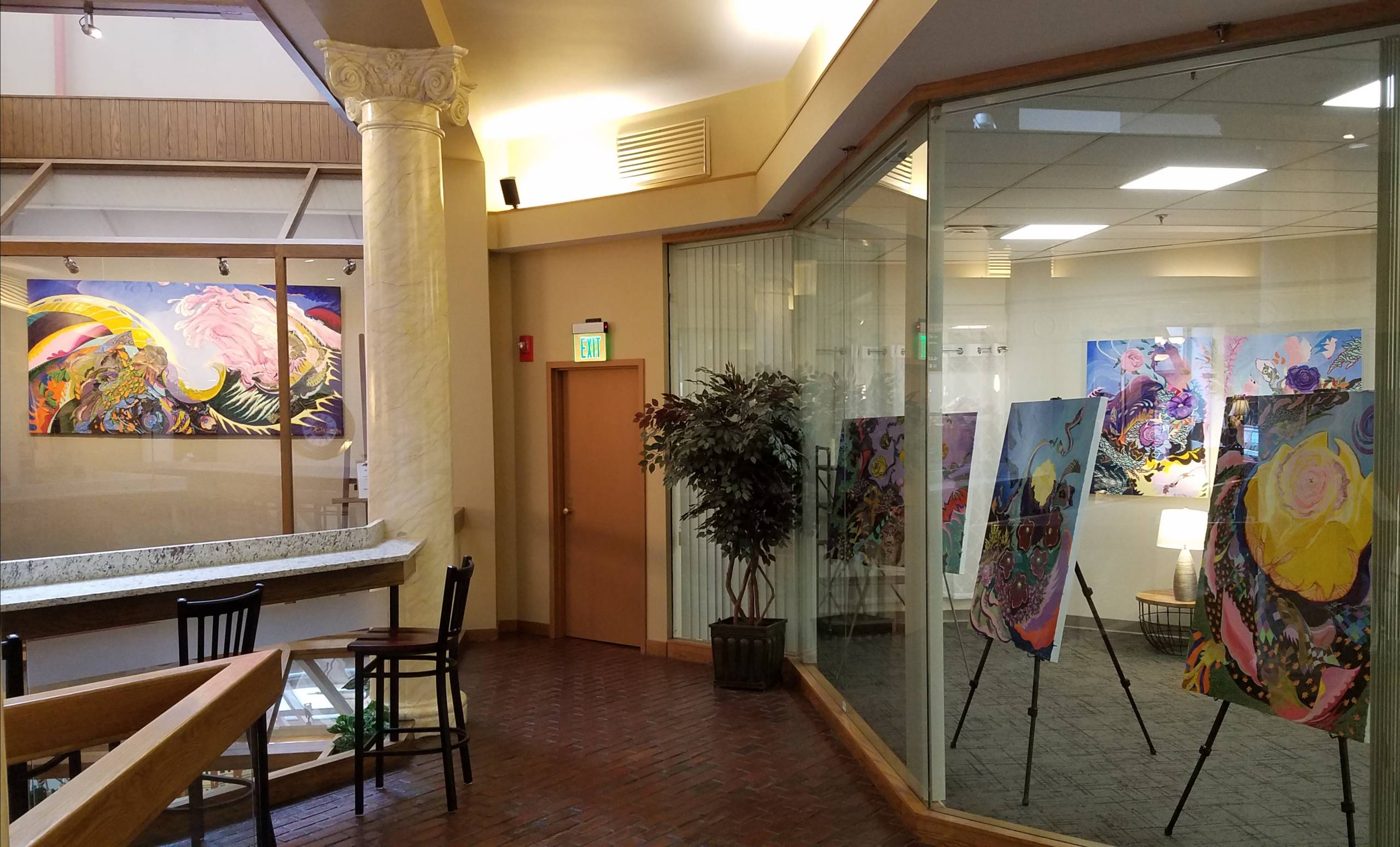 This exhibit will run at least through October 2020. Alongside the Pandemic Posies is “WAVES” an eight-foot painting produced at the beginning of 2020.