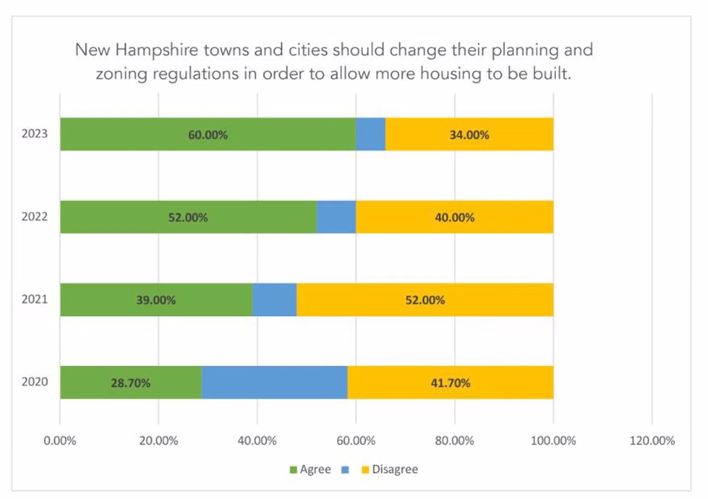 In a recent St. Anselm Ethics in Society poll, 60% of those surveyed agreed that towns and cities in the state should change zoning and planning regulations to allow more housing. That’s up from 28.70% in 2020. But 34% of those surveyed disagree.