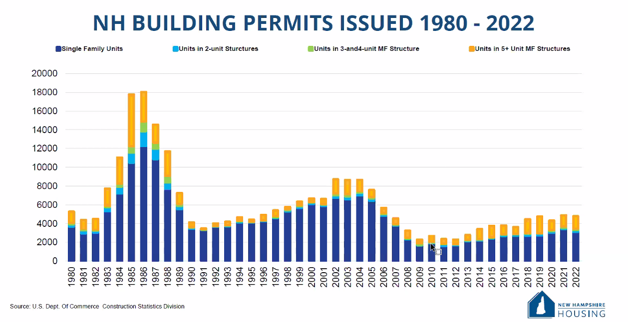 In 2019, both neighboring Maine and New Hampshire each issued about 4,900 housing building permits. Since then, Maine has issued 5,500 more than New Hampshire, according to the NHAR.