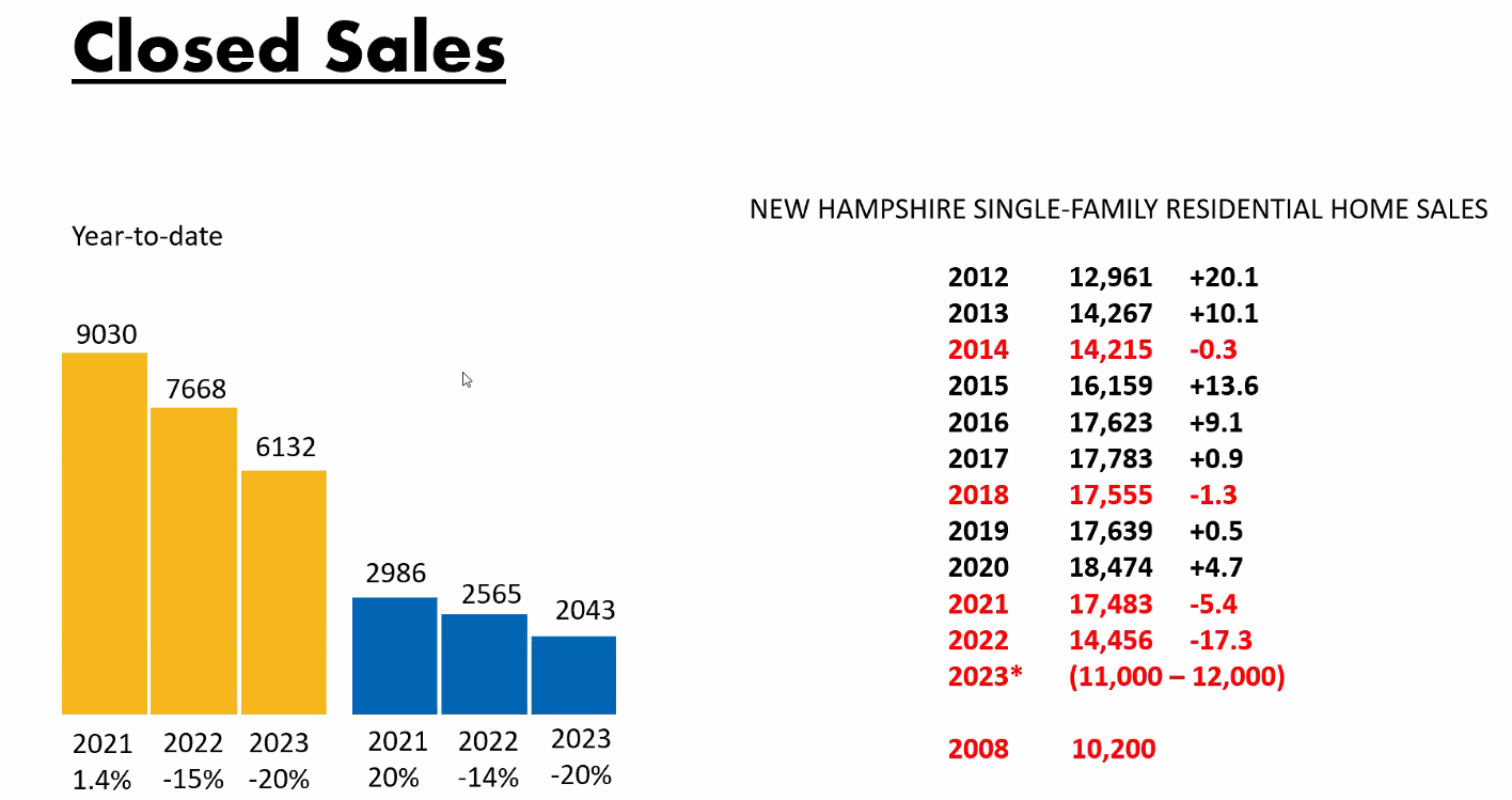 Closed sales also tell the housing crisis tale – so far they are down 20% from last year, when there was a 17% drop from 2021. The projected 11,000-12,000 closed sales for 2023 would be the lowest since 2008’s 10,200. That year, the bottom fell out of the housing market, spurring the Great Recession.