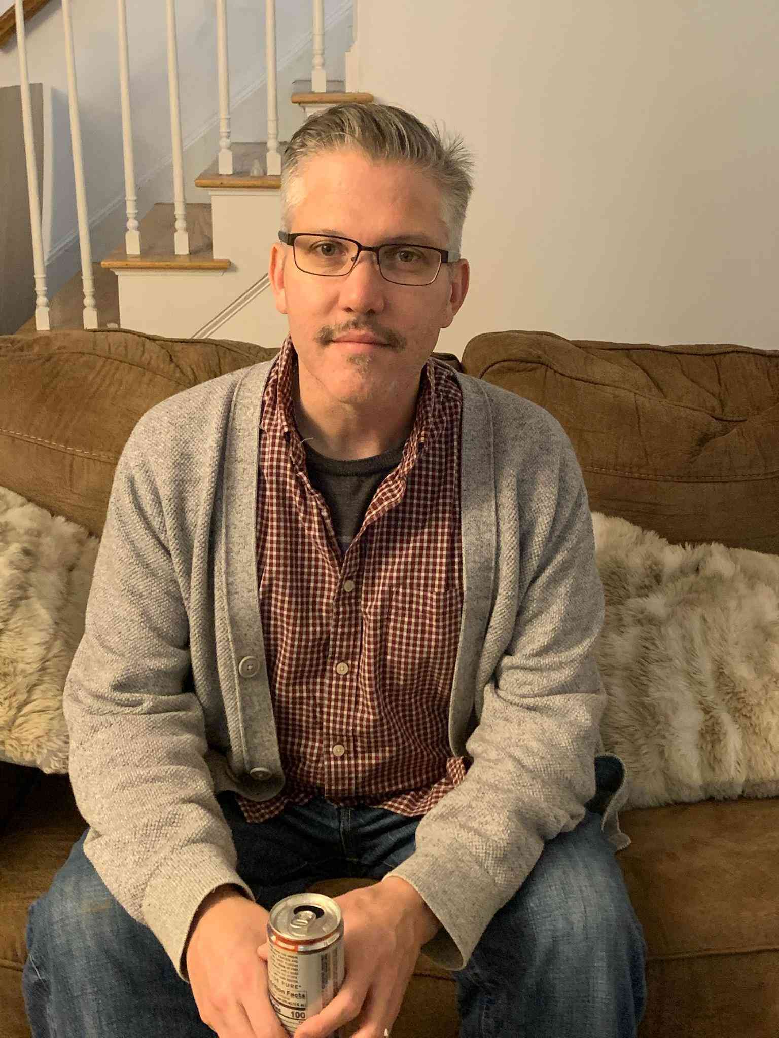 Today, however, as I was driving into work, I caught a glimpse of myself in the rearview mirror. I was wearing a gray cardigan and a burgundy collared shirt with this ridiculous mustache and I nearly drove off the road.