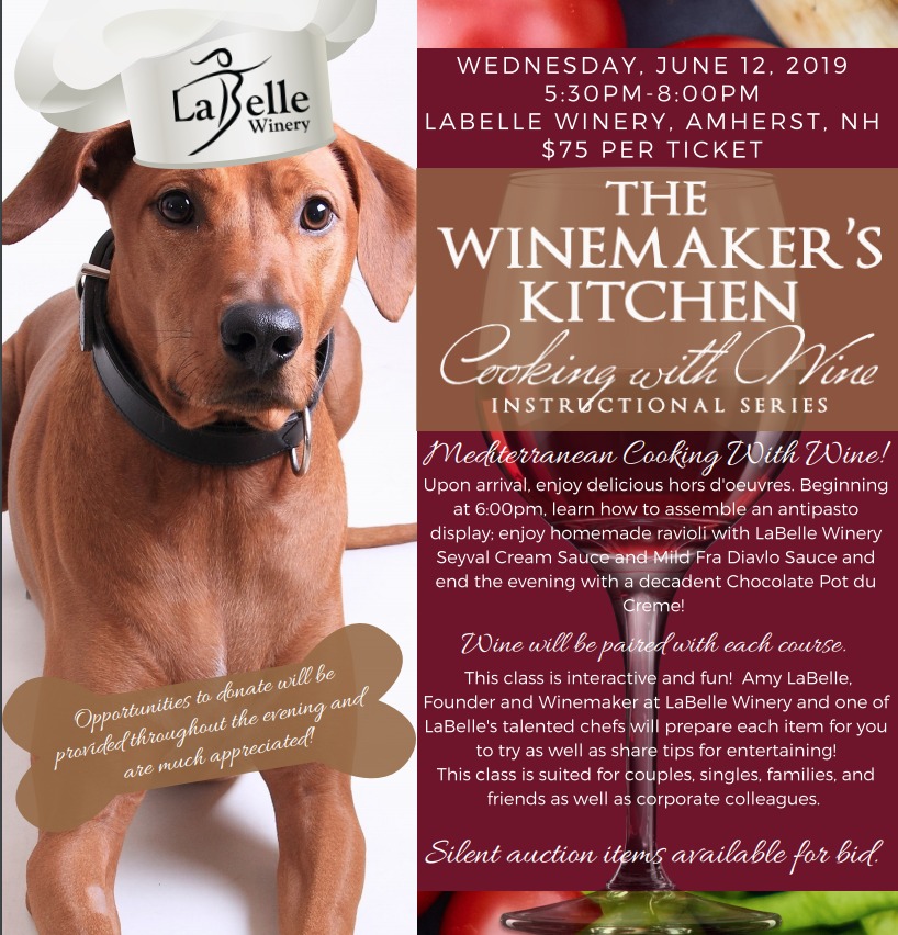 AMHERST, NH – Take the time to Paws for Wine on June 12 for a fun and interactive “Cooking with Wine” instructional by Amy LaBelle, Founder and Winemaker of LaBelle Winery alongside LaBelle’s talented chefs.