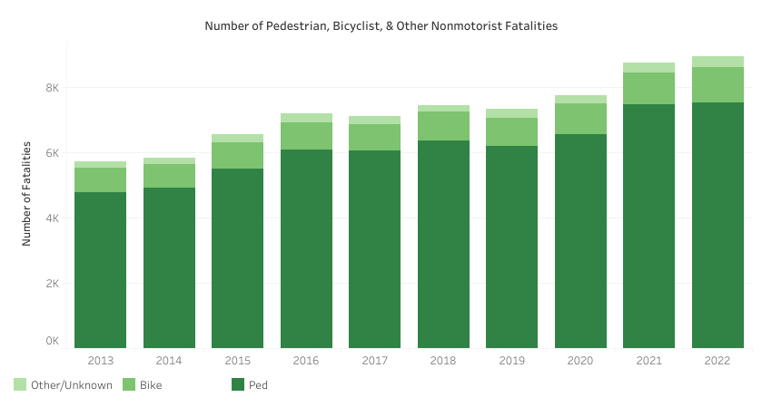 Perhaps the steepest jump came in just the last two years. From 2020 to 2022, rates of non-motorist injuries are up sharply: