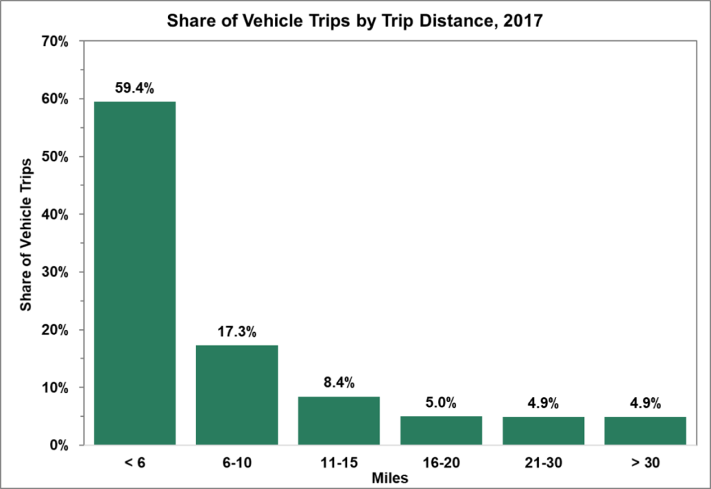 Data provided by the US DoE on one-way household trips show that the majority (59.4%) of vehicle trips were less than six miles. In fact, three-fourths of all trips are ten miles or less. Another 8.4% of trips were between 11 and 15 miles, with the three longer trip distance categories about 5% each. Of all the trips, 95% were 30 miles or less.
