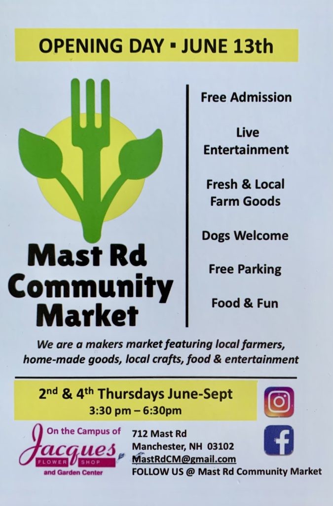 As previously mentioned in InkLink on April 7th, this community-focused market is planned in the spirit of the old fruit and farm stand at Jacques Flower Shop & Garden Center that many readers may recall. The goal is to bring back a local market featuring the farmers and makers in the community, creating a place where neighbors come together and support the Goffstown/Pinardville community with a focus onย farm fresh vegetables, locally sourced products, artisans, and live music at each market. See the image for more details. Jacques is next door to Electric You Hair Design, often with a bright yellow Mazda out front.