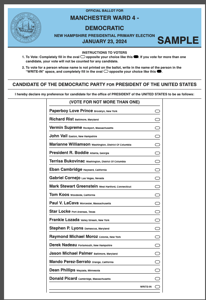 Phillips wants your vote on Jan. 23. Call it a belated birthday gift if you want to, but Phillips prefers you see him as the only best choice to move the country forward. You’ll find him (literally) somewhere near the bottom of the actual NH Democratic ballot. But at least he’s on there, unlike his main opponent, President Biden, who is skipping New Hampshire and moving straight to South Carolina on the game board that has become this year’s presidential primary.