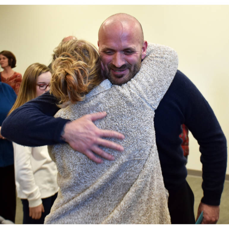 Christopher Ruggles receives a congratulatory hug at his graduation from the Merrimack County Drug Court in Concord on January 28. He was the first person to graduate from the program. (Photo: Anna Berry)