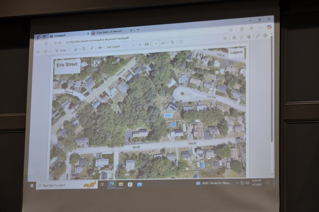 Slide from the May 1 Planning Board meeting showing the Erie Street neighborhood from above. Photo/Andrew Sylvia